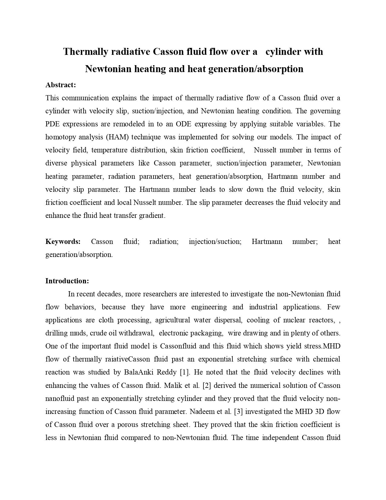 Sé el primero en valorar “Thermally radiative Casson fluid flow over a cylinder with Newtonian heating and heat generation/absorption”